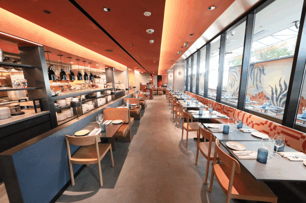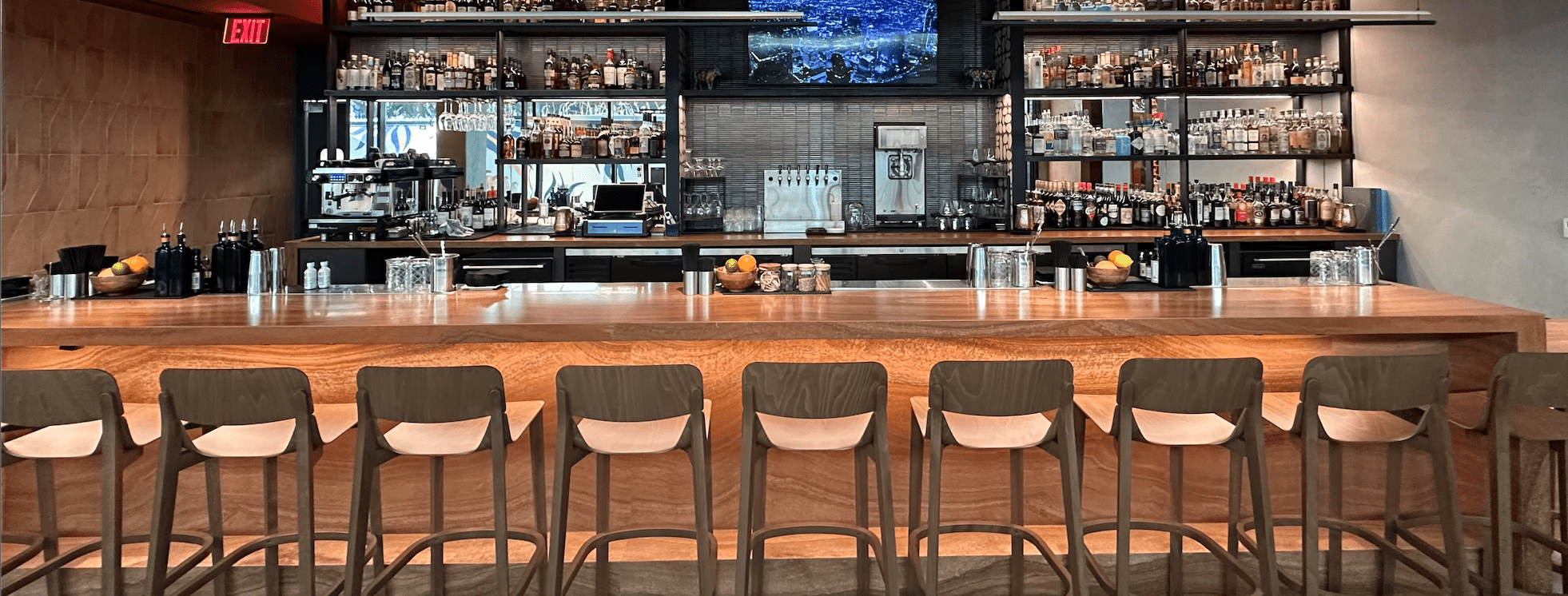 Our bar top features 12 full-service seats with USB and electrical ports — and of course, those essential purse hooks. Behind the bar are three spacious booths with clear views of the TV and quick access to the outdoor area. The blend of comfort and functionality makes this space ideal for casual drinks or relaxed gatherings.
